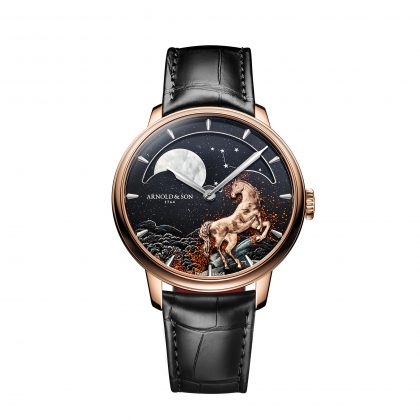 Mystical, untamed and dazzling, the Perpetual Moon 41.5 Red Gold “Year of the Horse” follows in the footsteps of Arnold & Son’s Chinese zodiac collections. In the year spanning 2026 and 2027, the Fire Horse will set the astrological tone for connoisseurs of watchmaking and métiers d’art. To celebrate this flamboyant sign, Arnold & Son presents a limited edition of eight pieces, housed in 41.5-mm red gold cases. And while the noble animal is ever alert, it is at night that the full extent of its fiery, mysterious and incandescent nature is revealed.
