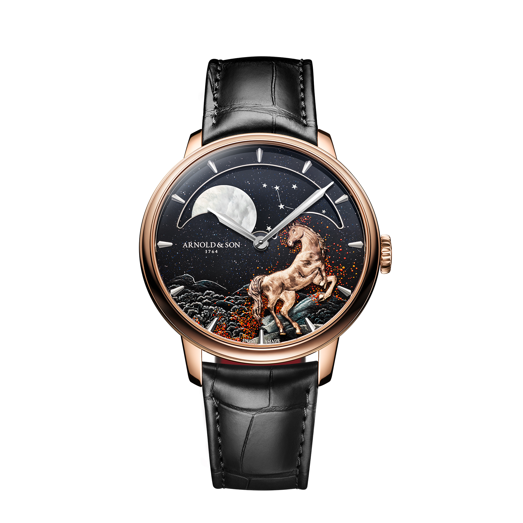 A horse rears on a hill top – a commanding silhouette carved out against a star-studded sky, surrounded by the sparks of a metaphorical fire. This is Arnold & Son’s interpretation of the Fire Horse, the sign that will succeed the Wood Snake on 17 February 2026. For the sixth consecutive year, Arnold & Son is back in the saddle, drawing on the full breadth of its artistic savoir-faire. Miniature painting, three-dimensional engraving, fine stonework and the refined finishing of an astronomical moon-phase calibre: the Perpetual Moon 41.5 Red Gold “Year of the Horse” tells a tale of excellence, symbolism and vital energy.