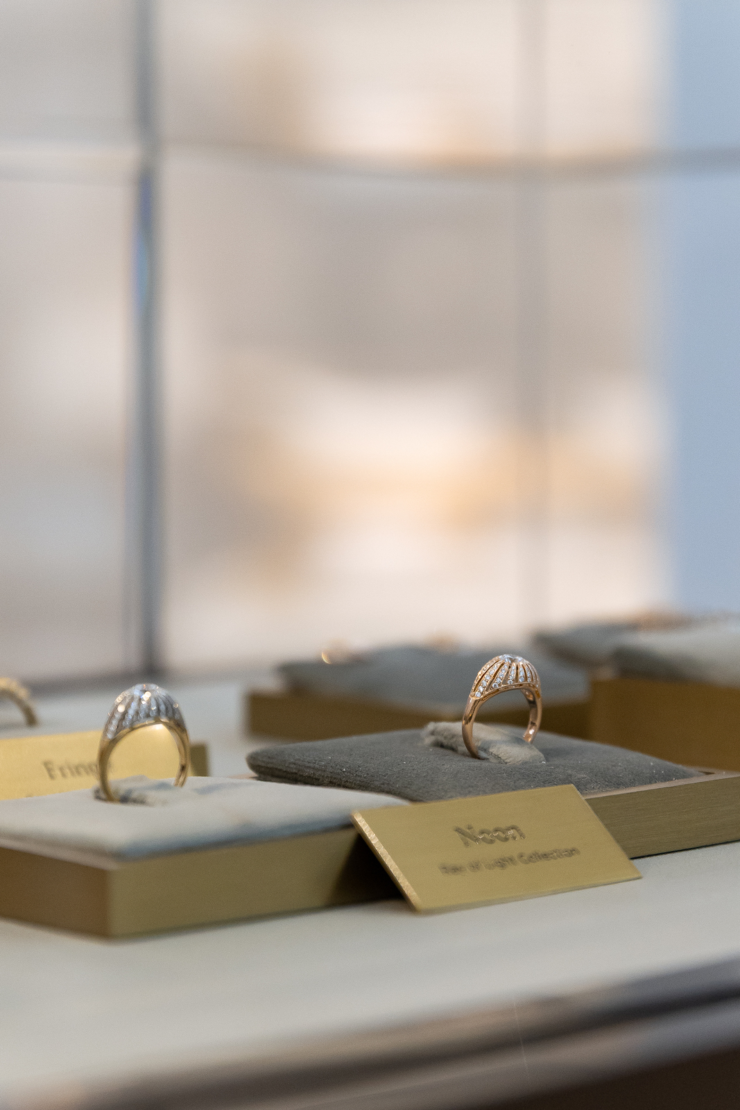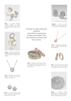 ในนิทรรศการนี้ทุกท่านจะได้พบกับการนำเสนอเรื่องราวของ “แสง” ในหลายมิติ ทั้งผ่านผลงานศิลป์ งานจิวเวลรี่ และเทคนิคการรังสรรค์เครื่องประดับระดับสูงที่หาชมได้ยาก ไฮไลต์สำคัญคือการจัดแสดงคอลเลคชั่น “Ray of Light” ซึ่งตีความความงามของแสงใน 9 รูปแบบ ตั้งแต่แสงแรกแห่งรุ่งอรุณไปจนถึงการหมุนเกลียวของกาแล็กซีห่างไกล แต่ละชิ้นถ่ายทอดอารมณ์ของแสงในช่วงเวลาต่าง ๆ ไม่ว่าจะเป็น “Dawn” ที่ได้แรงบันดาลใจจากศิลปะอาร์ตเดโค, “Glow” ที่อบอุ่นและอ่อนโยน, “Spirale” ที่สื่อถึงเกลียวจักรวาล, หรือ “Galaxy” ที่สะท้อนความพิศวงไร้ขอบเขต และแสงในอีกหลายมิติ