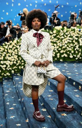 Doechii wears Louis Vuitton by Men’s Creative Director Pharrell Williams to the 2025 Met Gala. The bespoke silhouette is composed of a tailcoat and a matching waistcoat worn over a white poplin dress shirt with shorts. The tailcoat and waistcoat feature pearl-encrusted buttons and are tailored in fine wool inscribed with the Louis Vuitton Monogram in light grey blue, while the collar of the tailcoat and the shorts are crafted in the same material inscribed with the Louis Vuitton Damier Azur. The ensemble is worn with burgundy silk socks and a burgundy silk bow. The look is paired burgundy leather LV Checker Mary-Jane shoes and a Speedy P9 Bandoulière 10 edition in supple leather hand-embroidered with miniature beads in the Damier Azur pattern.