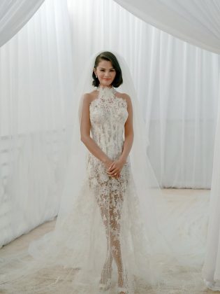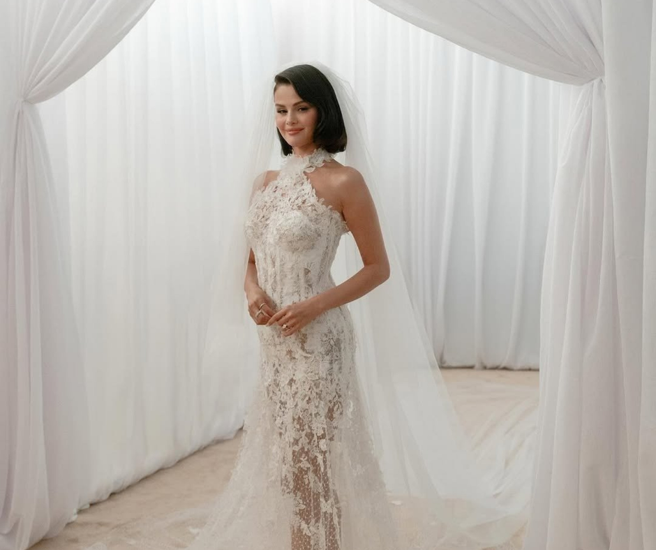 สำหรับพิธีแต่งงาน Selena ปรากฏตัวในเดรสผ้าไหมซาตินที่สามารถสวมได้สองด้าน โดดเด่นด้วยผืนผ้าพันรอบช่วงอกและด้านหลังอย่างประณีต คอเสื้อคล้องประดับลูกไม้เย็บมือ และปกเชือกถักมาคราเม่สุดละเอียด เพิ่มความอ่อนช้อยด้วยการปักลายมิติพิเศษ ส่วนในพิธีหลัก เธอสวมเดรสจาก Ralph Lauren Collection ที่ออกแบบขึ้นเฉพาะ ประดับดอกไม้ลูกไม้กว่า 300 ดอก และใช้เวลากว่าร้อยชั่วโมงในการปักคริสตัลและลวดลายละเอียดทั่วชุด โดยมีคอร์เซ็ทแต่งสีและปักชื่อย่อของคู่รักพร้อมวันแต่งงาน เป็นดีเทลลับสุดพิเศษที่ทำให้ชุดนี้มีเพียงหนึ่งเดียวในโลก
